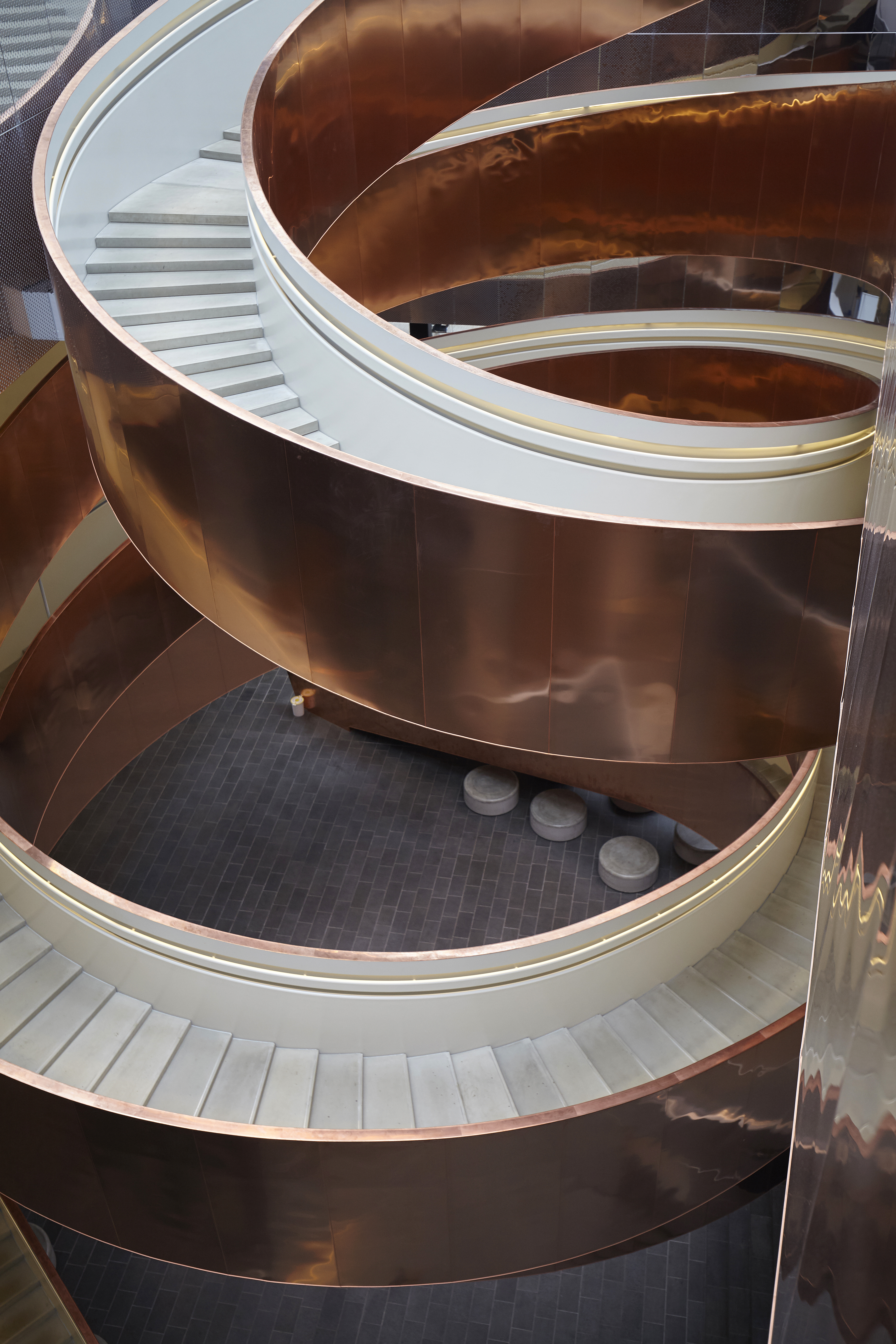 The impressive stairway was designed by CEBRA Architecture and constructed by CSK Stålindustri A/S. AE Stålmontage A/S was in charge of the copper cladding. The stairway is clad with approximately 10 ton TECU Classic copper (thickness 0.7 mm). Together the expressive surface of the copper and the design of this new stairway give a fascinating and spectacular expression, which greets the visitors when they first enter the building.